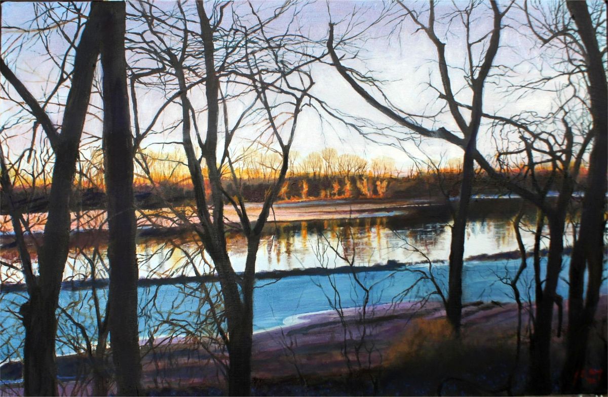 Dawn on the Far Shore Published March 31, 2026 at 2830 × 1850 Sunrise on the Missouri River, Booneville, MO., Spring, 2025 Oil on Canvas, Gallery Wrapped, 34″ x 22″ x 2″ Referrenced from original photograph by artist.