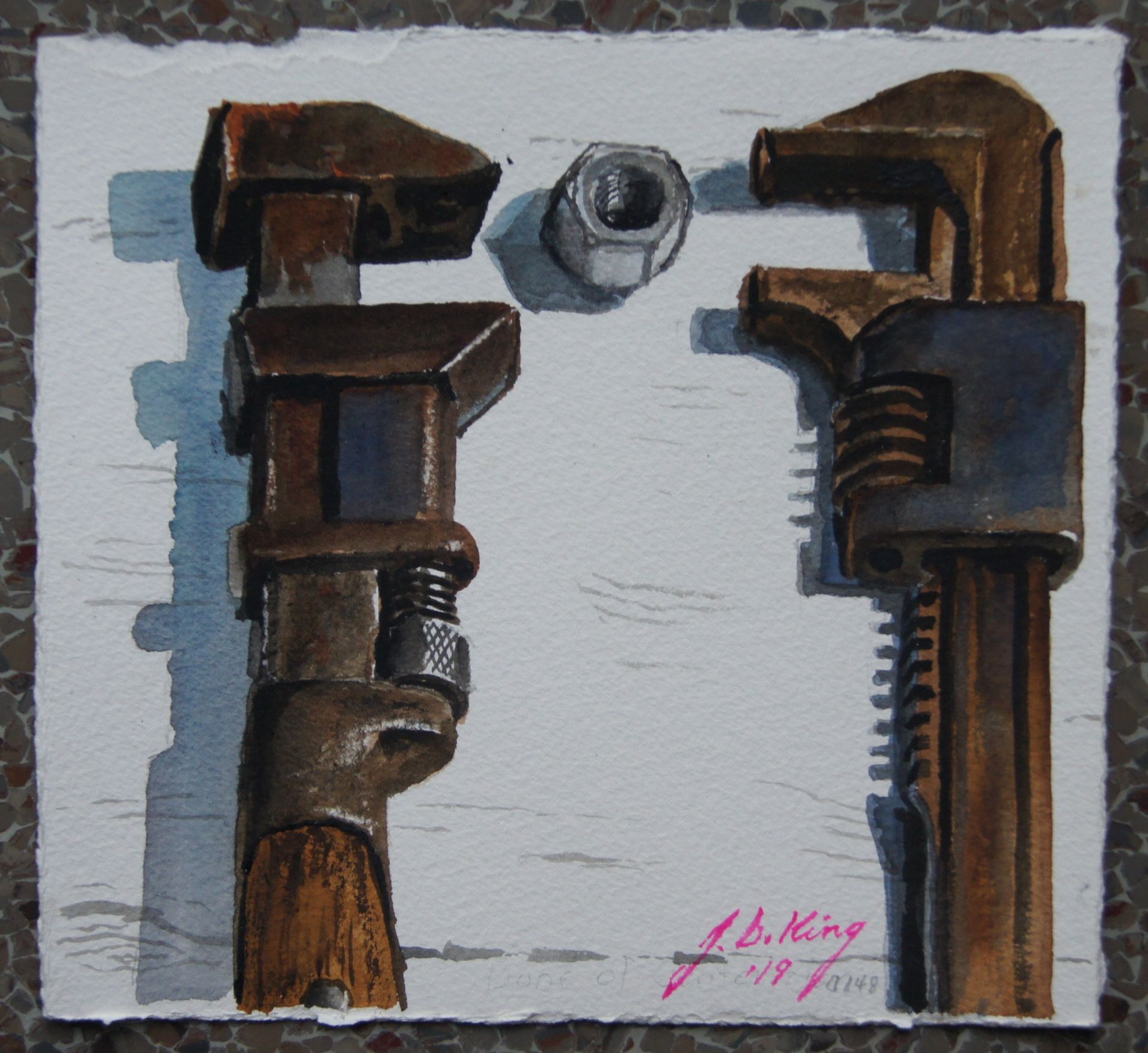Two Wrenches and a Nut Published October 10, 2019 at 1909 × 1750 I like to use anthropomorphic images as a way of commenting on things I find interesting in human behavior. Watercolor on 300 lb. Arches Cold Press