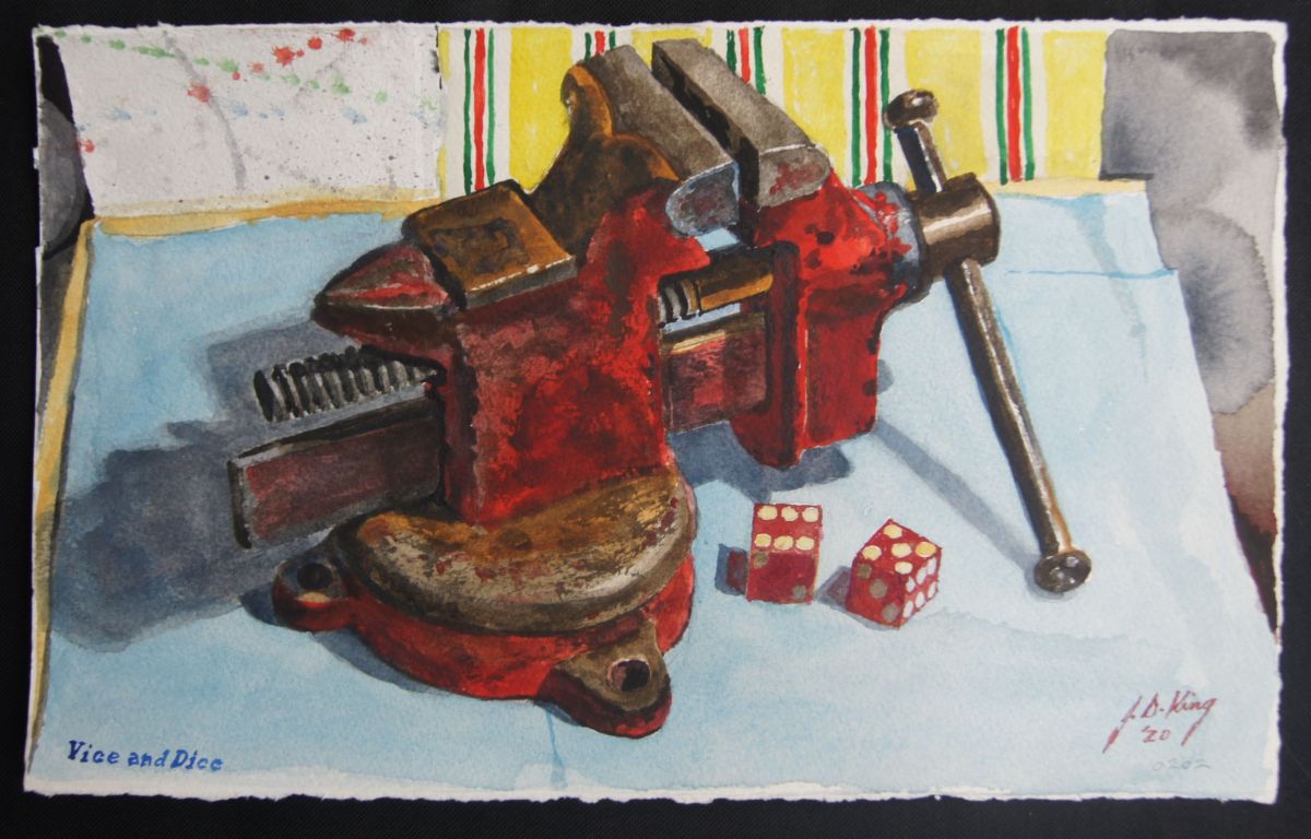 Vice and Dice Published July 27, 2020 at 2733 × 1750 Small swivel bench vice and a pair of “Riviera” unaltered gambling dice. Watercolor on 300 lb. Arches cold press, 9″ x 15″
