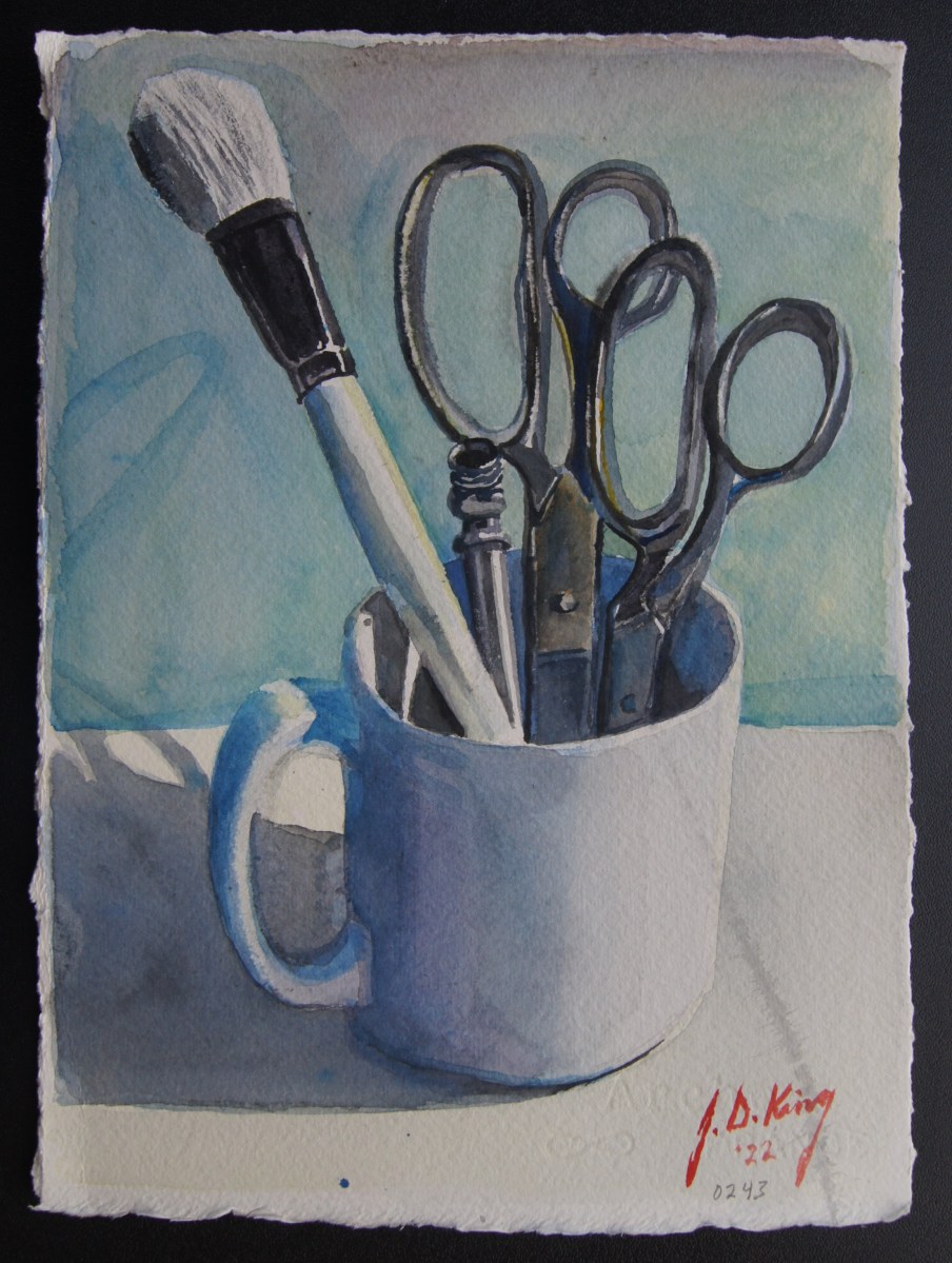 White Mop and Scissors Published January 20, 2022 at 2211 × 2934 Watercolor study of whites, grays, blues and black Watercolor on Arches 300 cold press 9″ x 12″