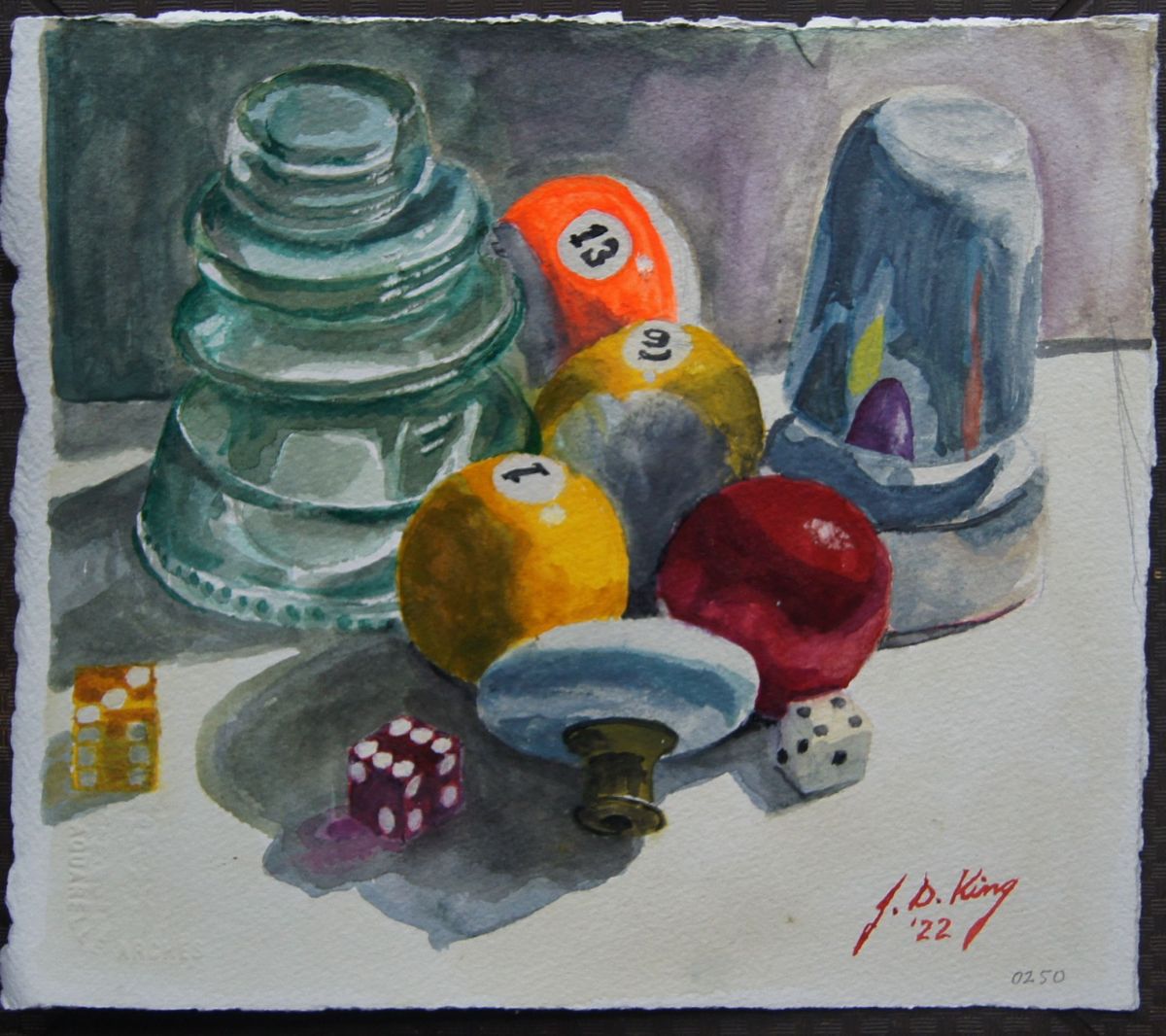 Billiards, Dice, Etc. II Published July 7, 2022 at 2082 × 1850 Rearranged still life of hard shiny objects from previous watercolor. Watercolor on 300 lb. Arches Cold Press, 111/2″ x 10″