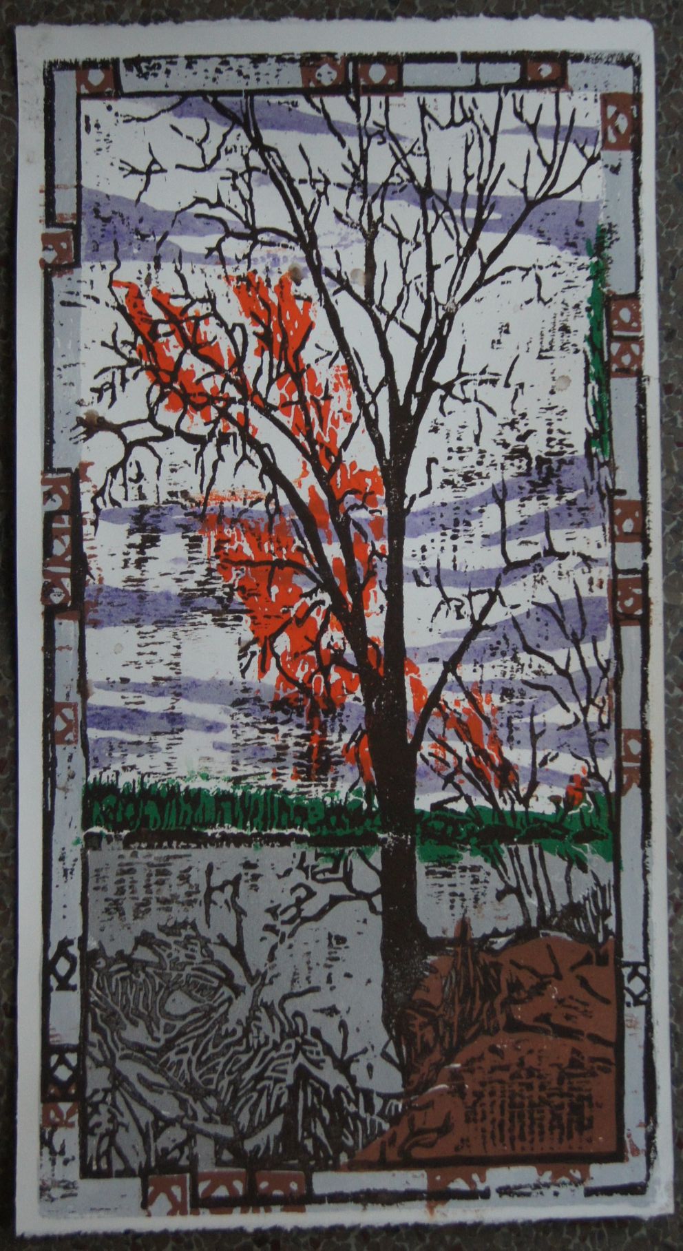 Missouri River at Easley Published October 24, 2022 at 992 × 1817 A large cotton wood on the River in the Fall Woodcut Print on Stonehenge Paper in seven colors, 12 1/2″ x 22″