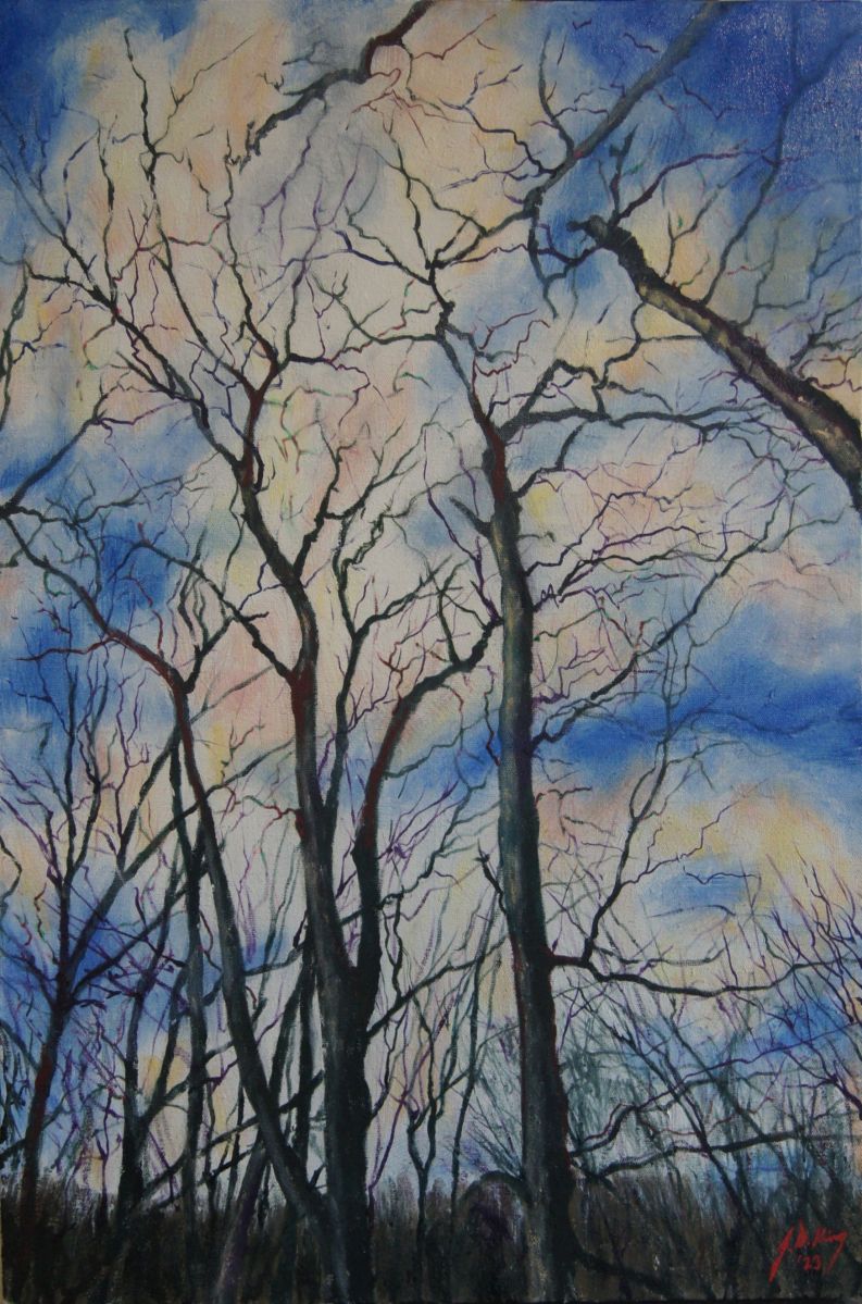 White Oaks in a Peppermint Sky Published February 9, 2023 at 1750 × 2647 This beautiful scene is right out my back door. Oil on Canvas, 24″ x 36″