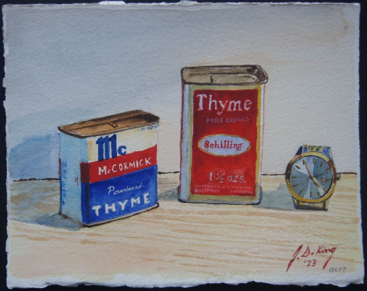Thyme, Thyme and Time Again Published June 13, 2023 at 2204 × 1750 I’ve always been a sucker for a good pun. SOLD Watercolor on 300 lb. Arches, 8″ x 10″