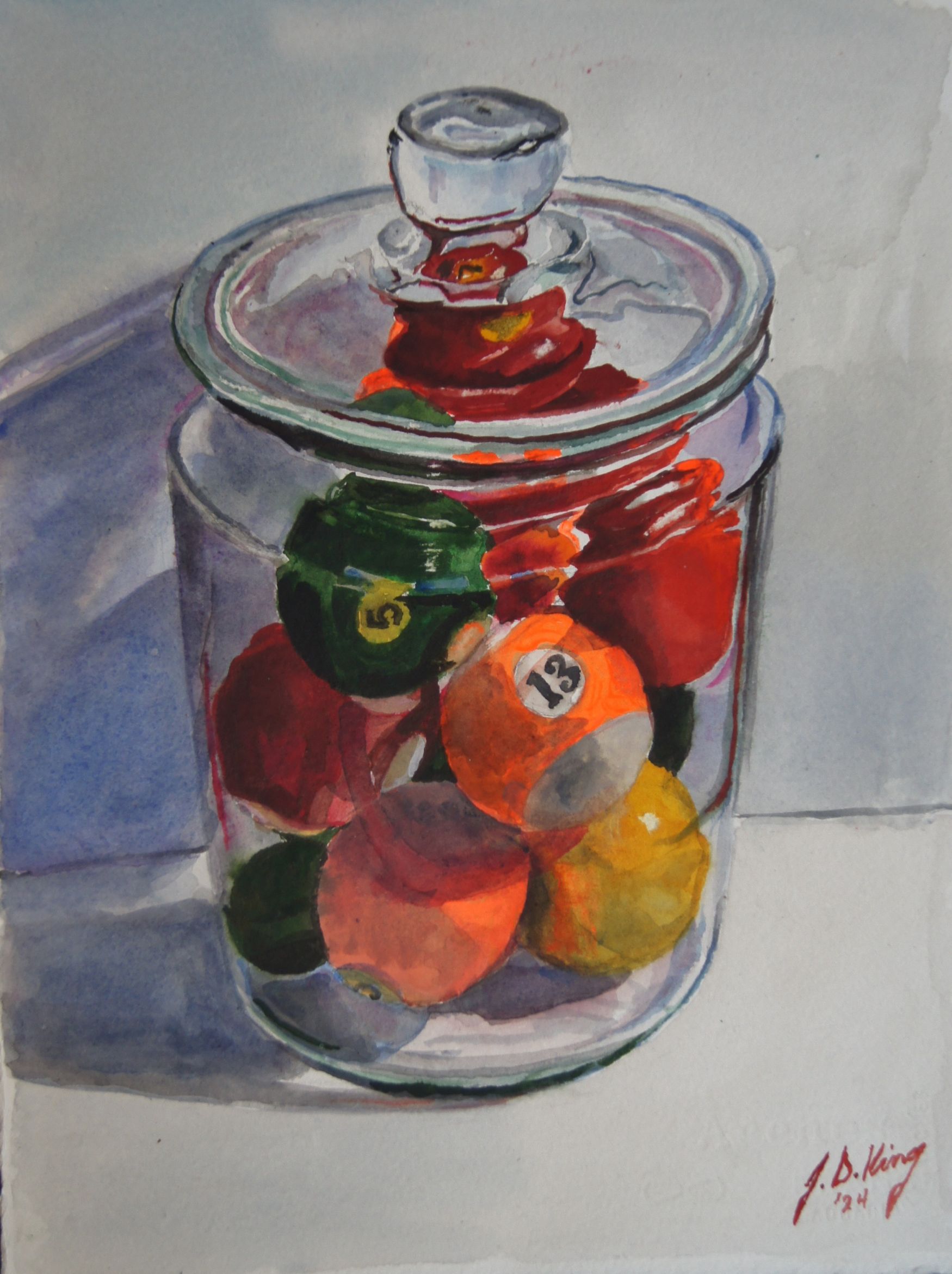 Billiard Balls in a Glass Jar Published January 26, 2024 at 1750 × 2342 Colorful balls in a glass cookie jar. Watercolor on Arches 300 lb. cold press 11′ x 18″