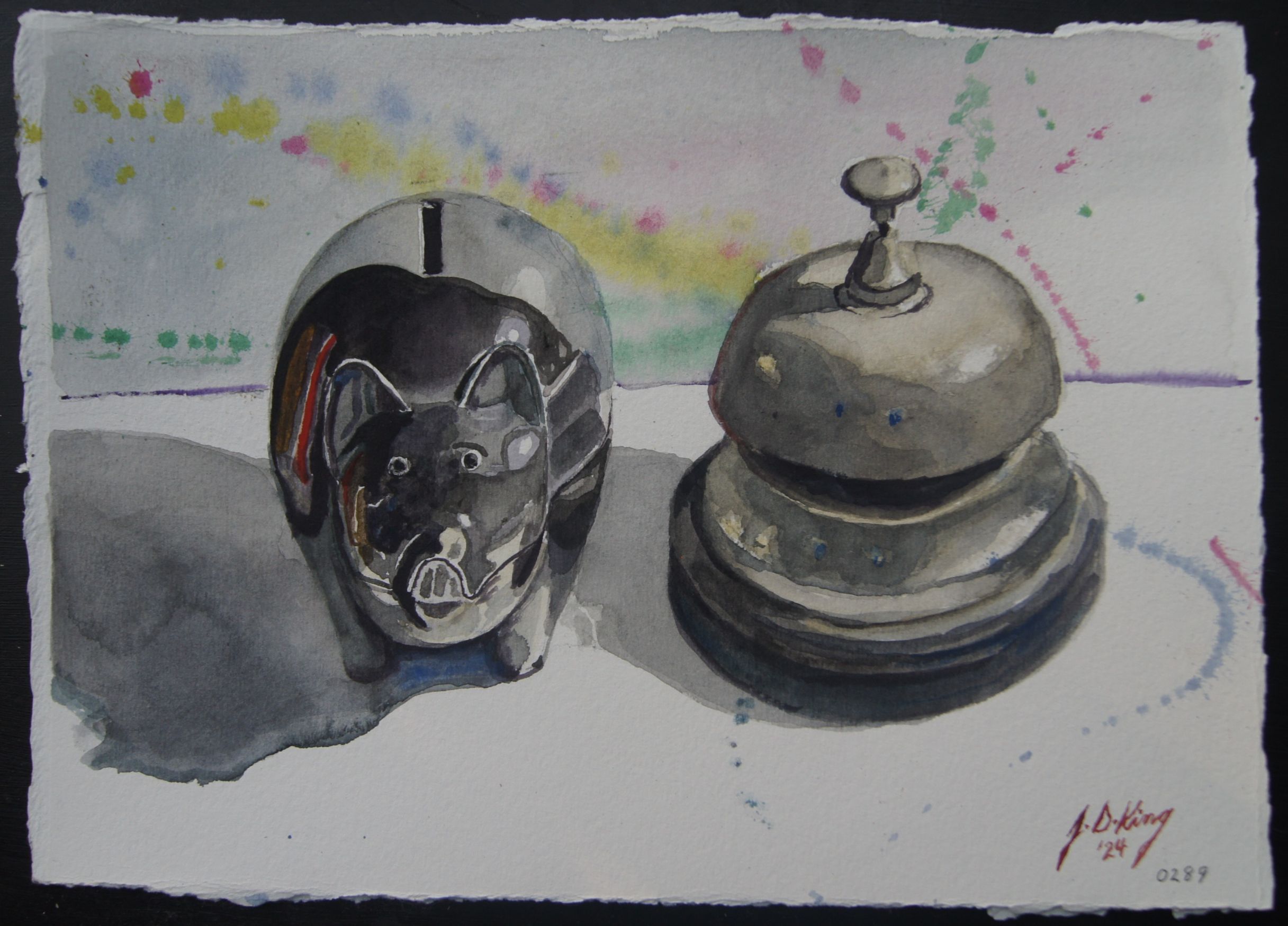 Piggy Bank and Bell Published July 14, 2024 at 2433 × 1750 Similar in size and appearence. Watercolor on 300 lb. Arches Cold Press 10″ x 13 1/2″