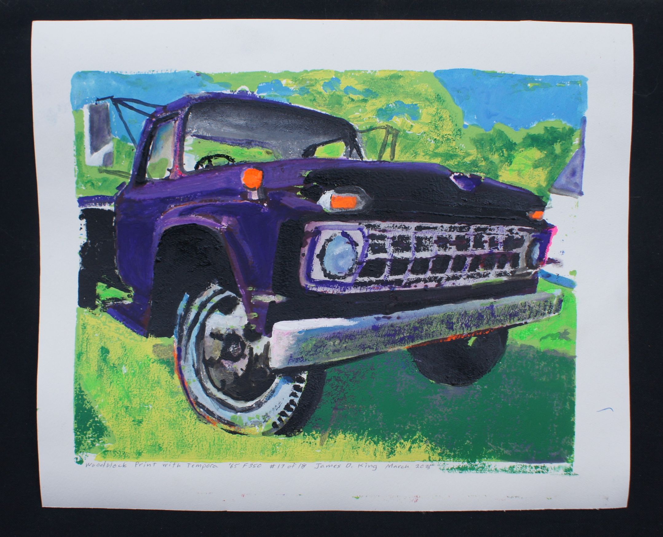 1965 F350 17 of 18 Published March 13, 2025 at 2157 × 1750 Old Ford in brighter colors. Woodblock Print with Tempora Paint, 17″ x 14″