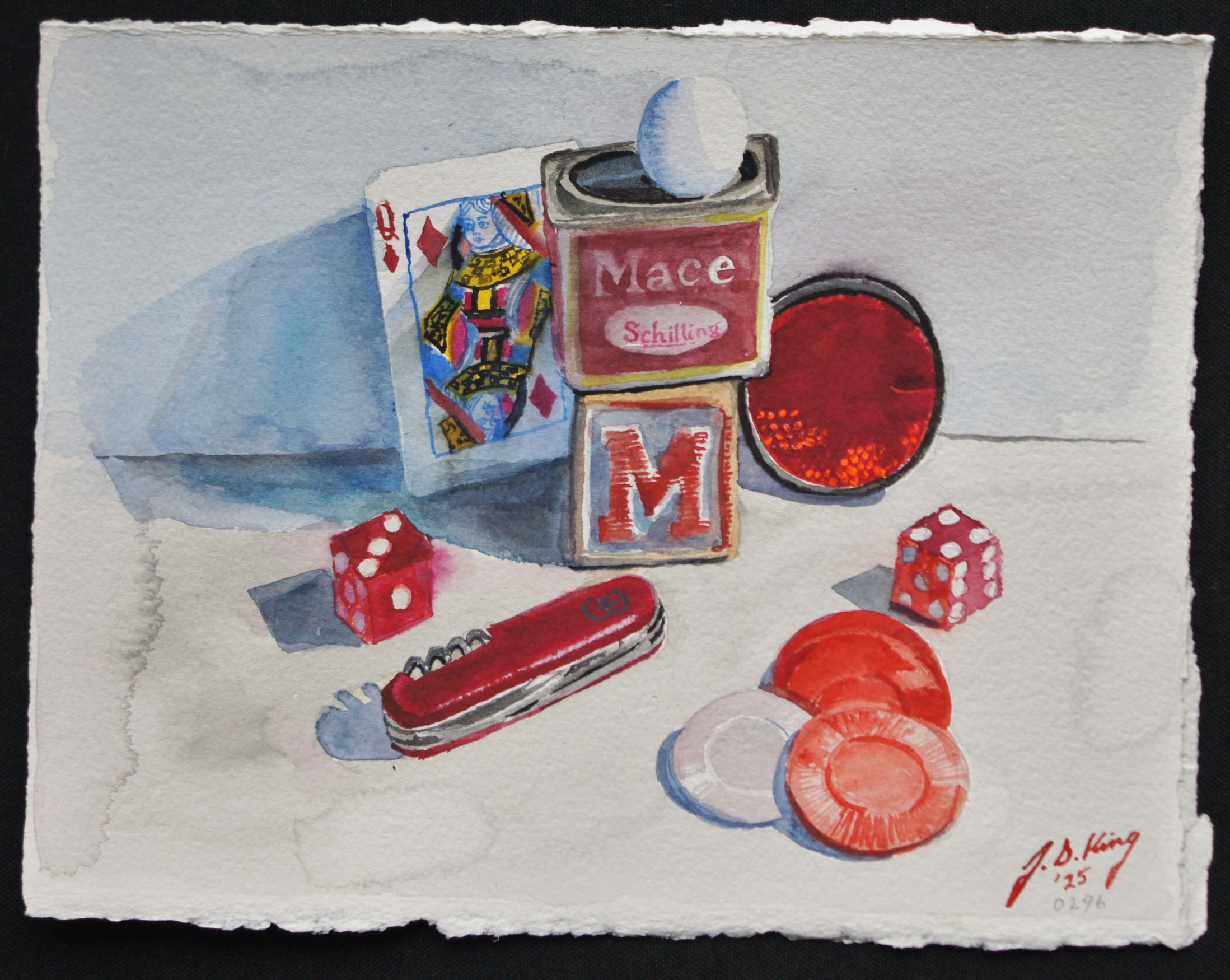 Queen of Diamonds Published April 19, 2025 at 2197 × 1750 Red items form around the house Watercolor on Arches 300 lb. Cold Press, 11′ x 9 1/2″
