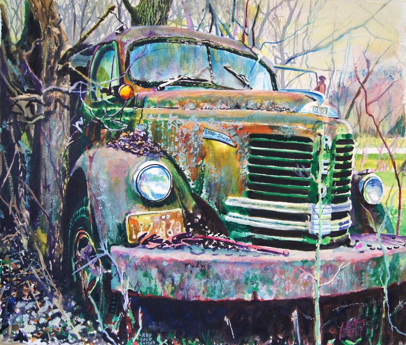 I used to work for Marshall Equipment Company (now Marshall Welding) after I graduated from Missouri Valley College with a degree in art. That was back in 1977. I was hired as a welder at Marshall Equipment and worked on many of those trucks in both the spring when folks were getting ready to plant and then on some of the same trucks in the fall when they were getting ready to harvest. I did that for a couple of years and then went back to work for Missouri Valley College as a part time ceramics professer for a few years. Those old farm trucks had very low milage because, for the most part, they only got used a couple of times a year. I was fascinated with them because I felt and still feel like they embody some very powerful values of hard work and effeciency and to a large extent the esthetic qualities of what those guys who were designing them embued in their creation. That may all sound rather lofty but I went to school for quite awhile and sometimes just can’t help it.
